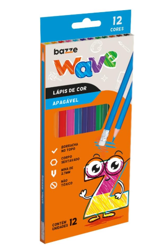 • O Lápis de Cor WAVE Apagável traz 12 cores vibrantes e se borrar, é possível apagar! Em corpo de resina não tóxica e ponta de 2,7mm.